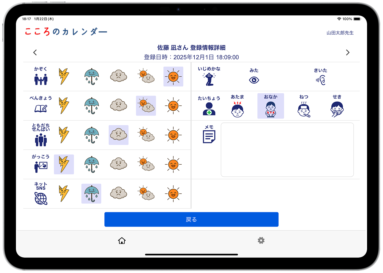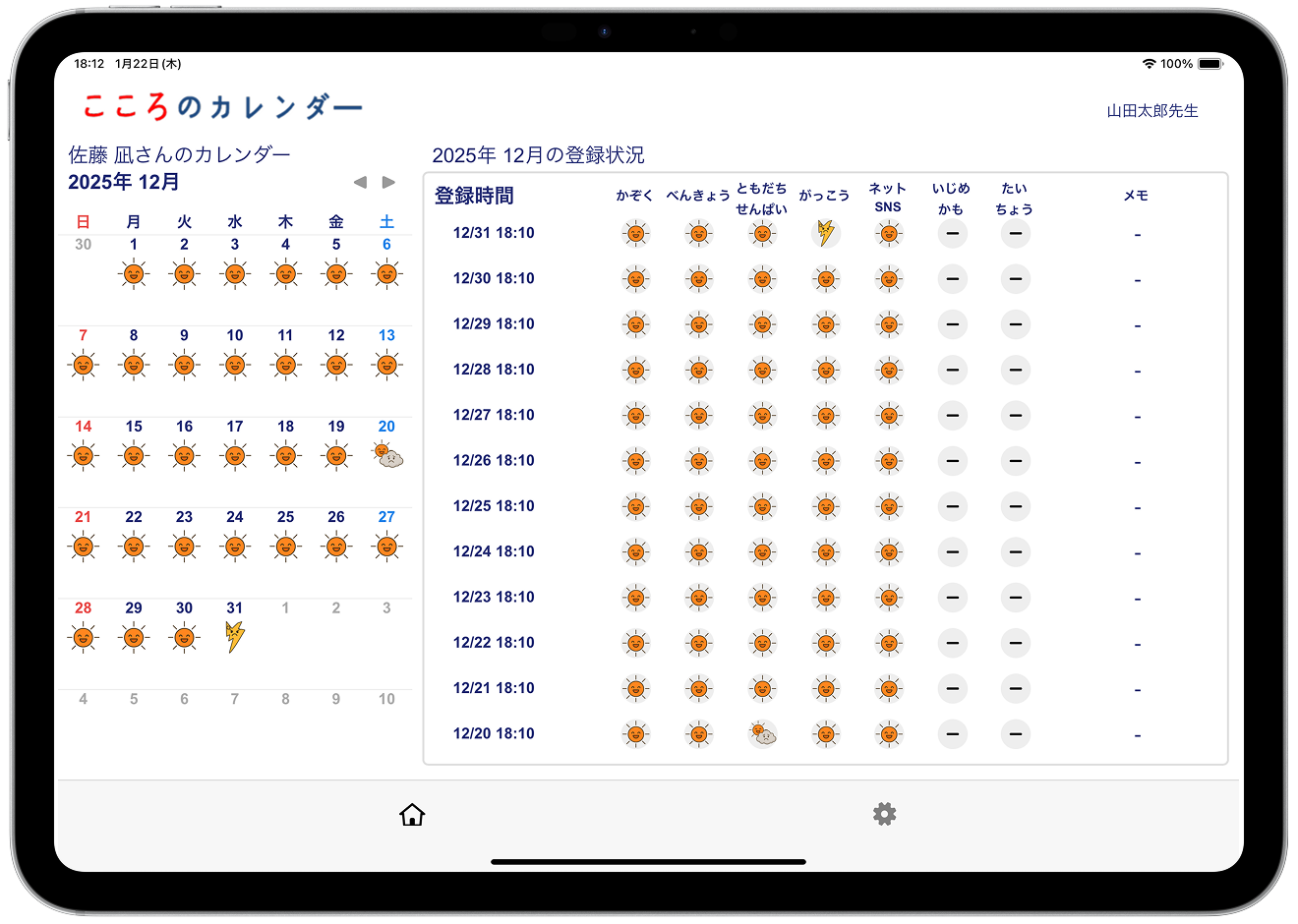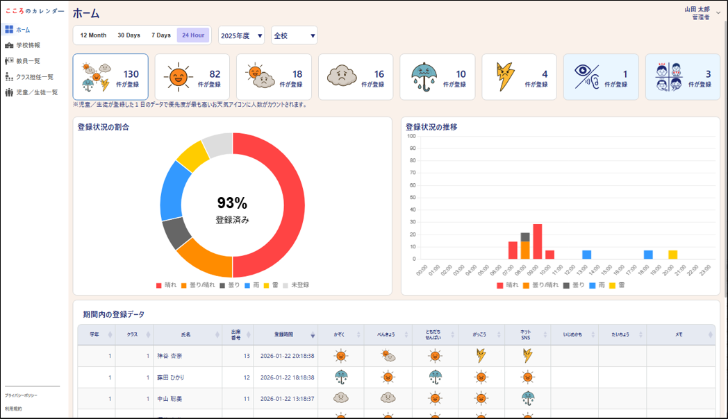 「こころのカレンダー」は児童生徒の不登校につながる環境やいじめられる環境(例えば、家庭や友人やネットなど)、更に、いじめを見たり聞いたりした情報を日常において捉える事ができるいじめや不登校に特化したアプリです。特に児童生徒、先生方が簡単に利活用できる様に操作性を重視したシステムです。1アカウント:40円/月(税込価格44円/月):半年程度の実験導入の場合は無料です。